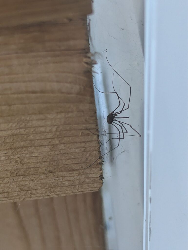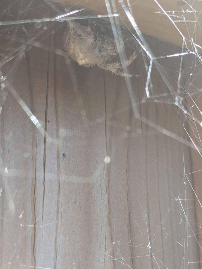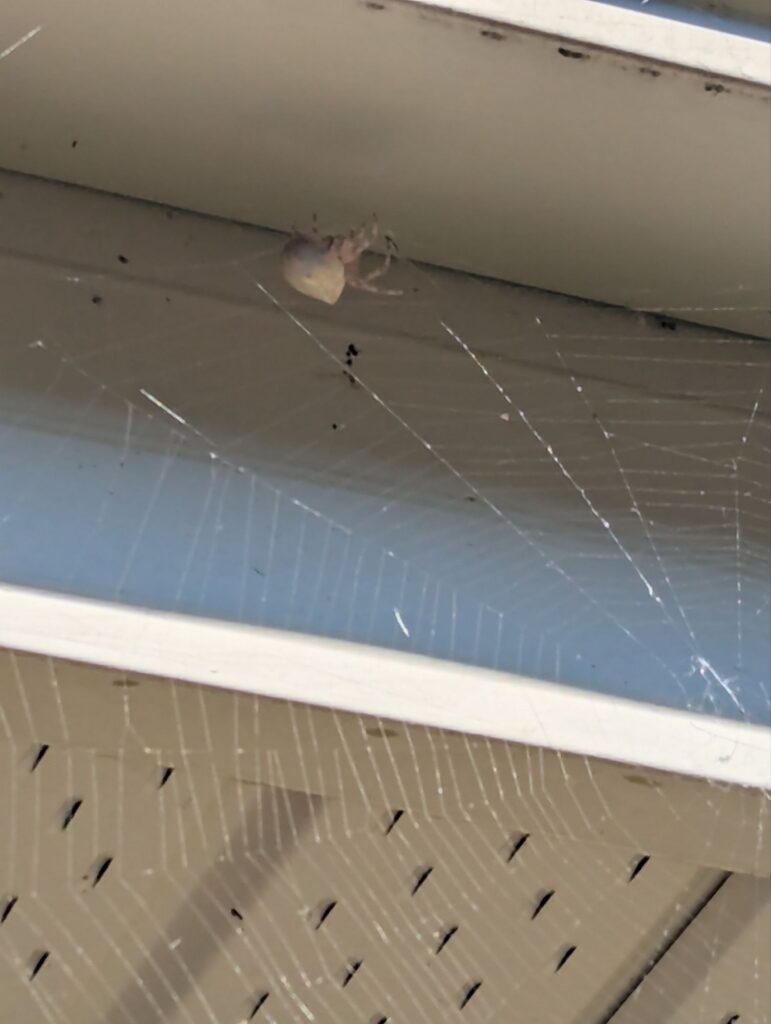 This one is pregnant. Her web is anchored to the roof of the garage, but one drag line stretches all the way to the ground it’s cool. Bonus harvestman -